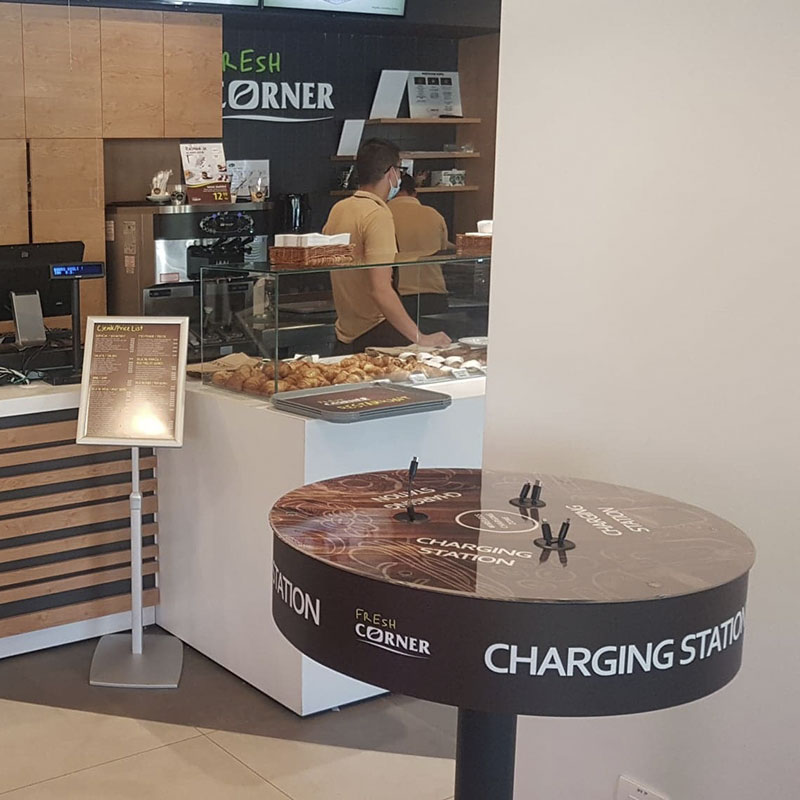 Lounge je stolić za punjenje mobitela sa 6 uvlačivih kabela za punjenje i integriranim Qi bežičnim uređajem. Potpuno prilagodljiv nudi mogućnost brendiranja i sponzorstva. Atraktivan dizajn za mjesta kao što su čekaonica, dnevni boravak, sajmovi, događaji, kafići i slično.